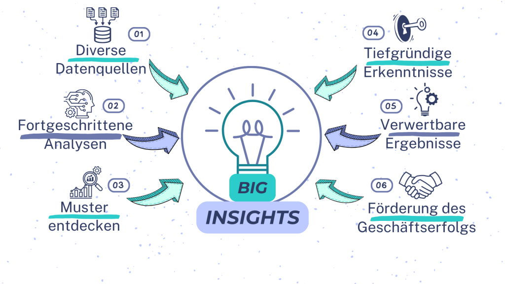 Big Data kann dabei zwar ein Teil der Lösung sein, wonach man aber eigentlich strebt sind die Big Insights: fundierte, relevante und nachhaltige Erkenntnisse. Big Insights ist das faktenbasierte Wissen oder die Informationen – also Daten – die, wenn man sie richtig hantiert, neue Wege der Entscheidungsprozesse eröffnen. Durch den Einsatz komplexer systematischer Anwendungen und Instrumente werden tiefgehende Einsichten in die Daten ermöglicht.
