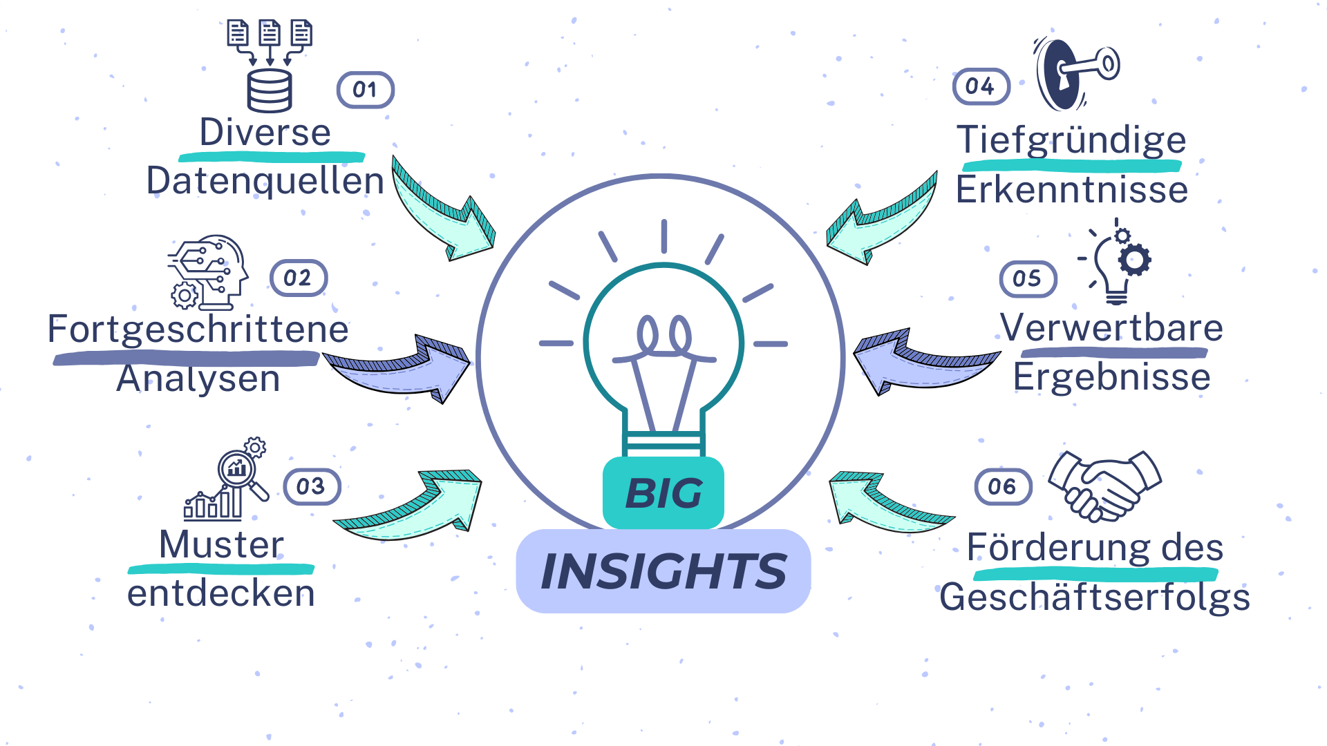 Big Insights basieren zu allererst auf einer mehr oder minder großen Vielzahl an diversen Datenquellen. Die unter dem Sammelbegriff Big Data erfassten komplexen, schnelllebigen und oft schwach strukturierten Datenmengen können ein Teil davon sein. Es müssen jedoch nicht immer Massendaten sein, sondern eine kleine, aber zielgerichtete Datenmenge kann unter Umständen bereits ausreichen. Mittels fortgeschrittener Datenanalyseinstrumente, bspw. ökonometrischer Modellierung oder Data-Mining, werden die Daten optimal ausgewertet. Dabei werden versteckte Muster offengelegt, die anschließend durch sinnvolle Interpretation tiefgründige und relevante Erkenntnisse zulassen. Dabei kann auf maschinelles Lernen zurückgegriffen werden, dessen Algorithmen auch aussagekräftige Prognosemodelle erstellen können. Dies ermöglicht den Entscheidungsträgern, sich über mögliche Ergebnisse, Risiken und Chancen zu informieren. Dieser Wandel hin zu einer datengesteuerten Entscheidungsfindung (data-driven decision-making) erhöht die Präzision, verringert die Unsicherheit und trägt zur strategischen Planung in verschiedenen Sektoren bei.