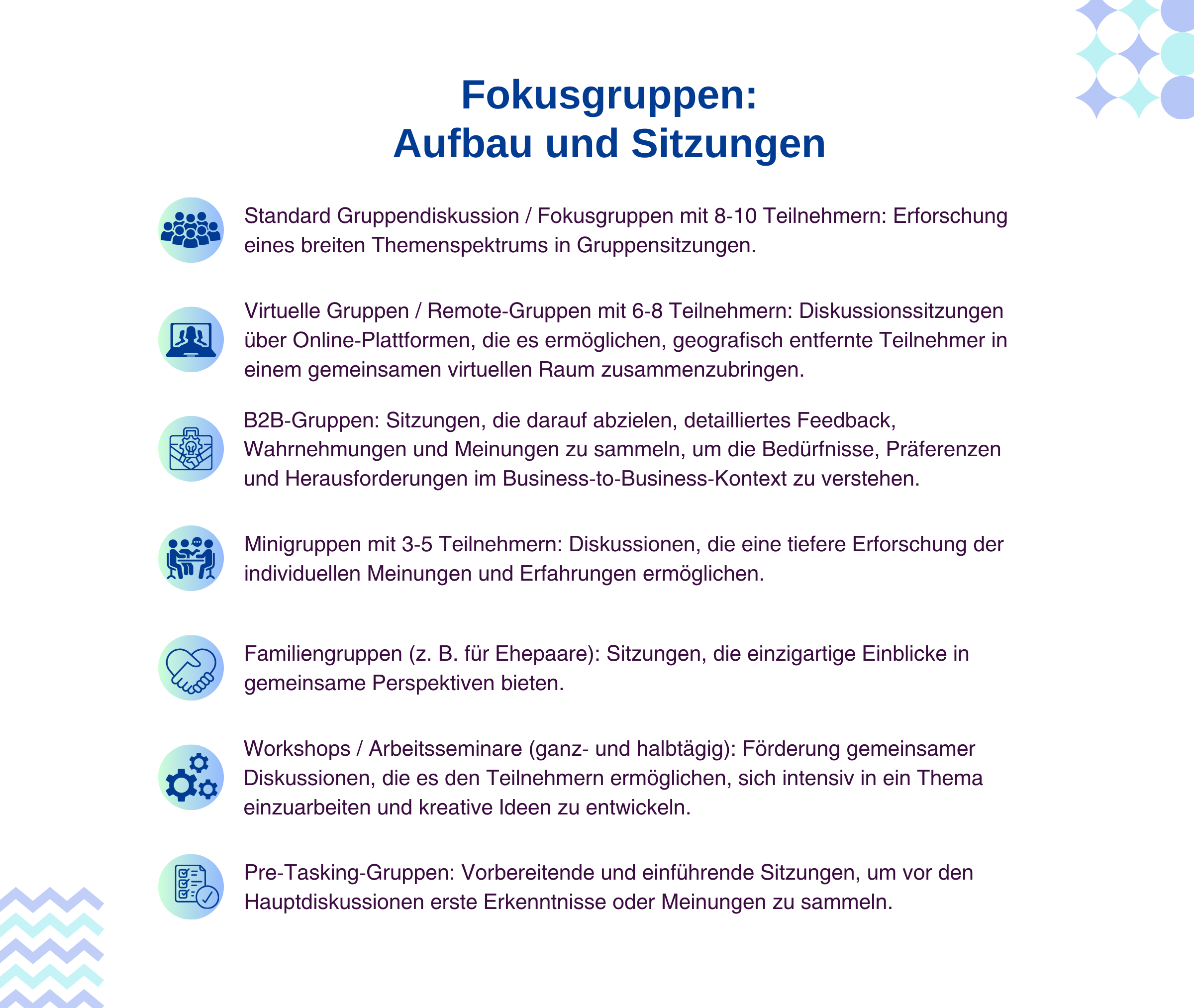 Die Fokusgruppentechniken bei BERENT sind vielseitig und eignen sich für eine Reihe von Forschungsanforderungen.